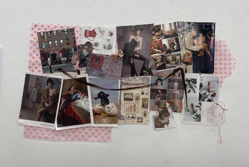 Today, we put together our materials. I brought fashion magazines and ribbons. I tried my best to think what I like and the colour palette. I also played with the colours for this display. Something that stands out is the cat. It’s kind of out of place but it still connects with these images.