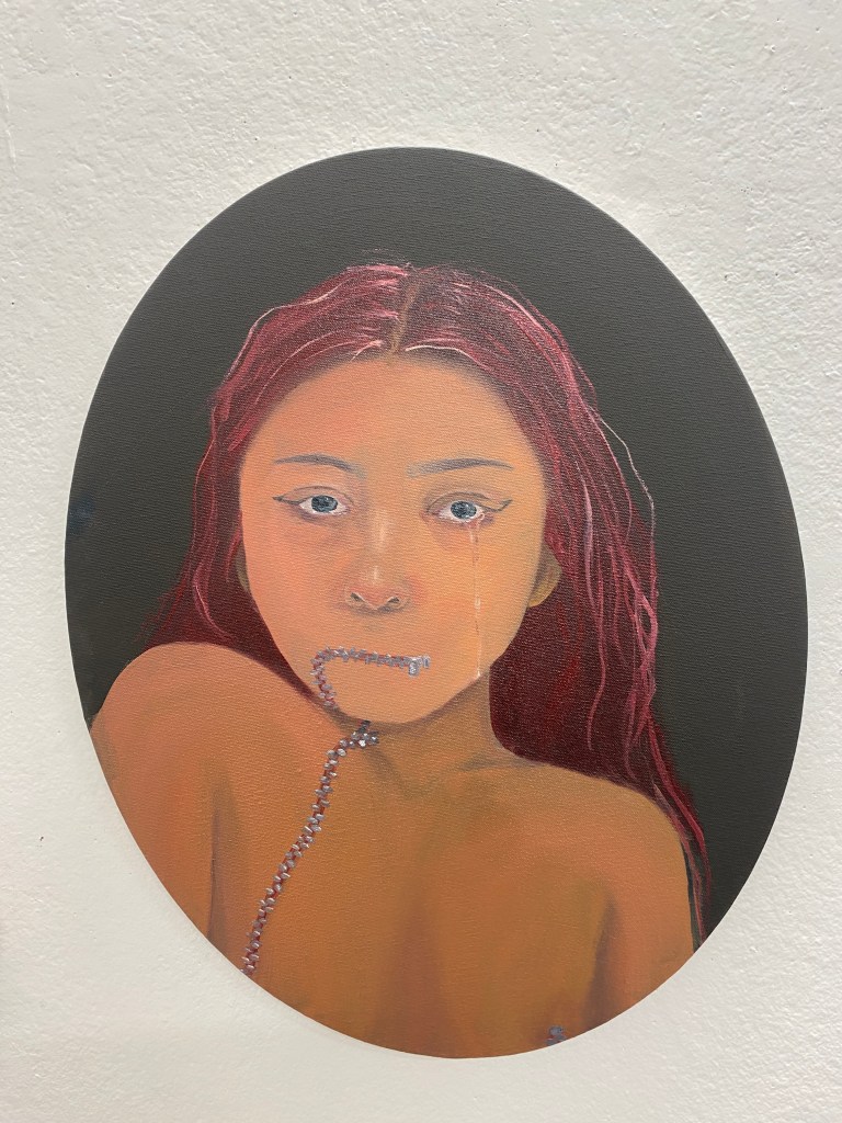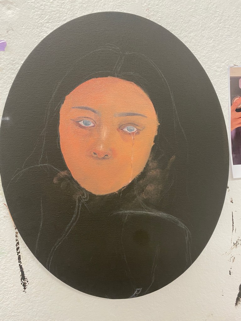 I’ve always been suggested to experiment with oil. When we were taught about oil painting in Evan’s workshop, I decided to buy oil paints. This artwork is my first oil painting. In this artwork, I wanted to portray the disconnectedness towards my heritage. This is due to not being taught my native language. When I’m surrounded by my Filipino friends or family, I feel guilt and shame for not speaking or understanding.