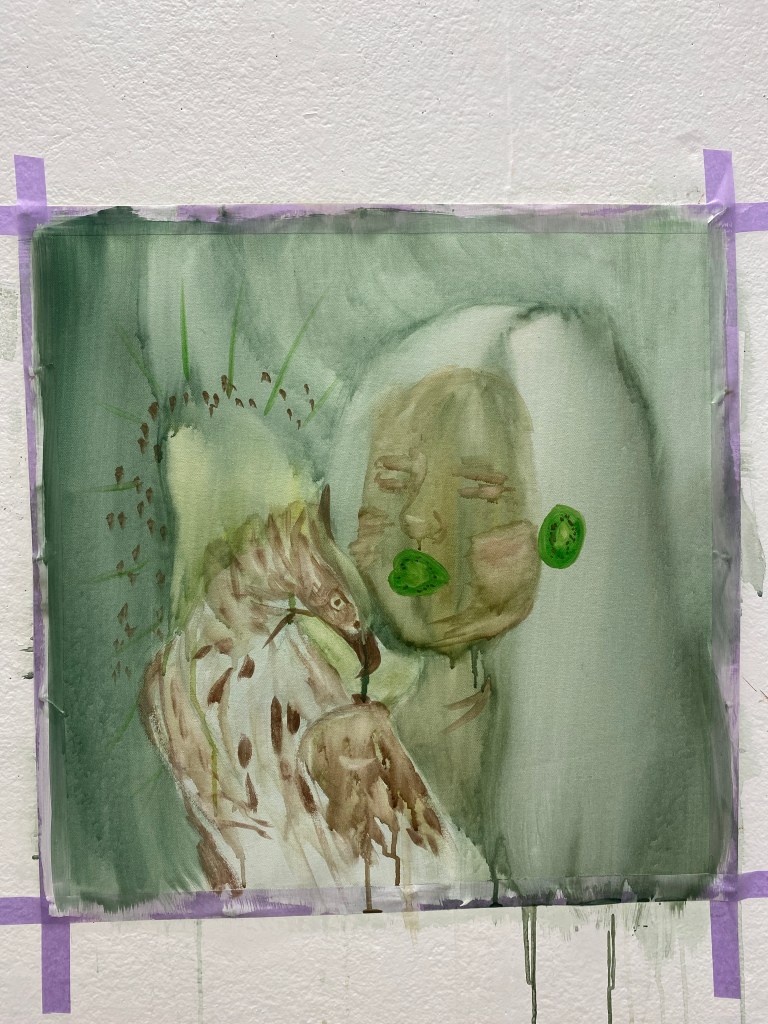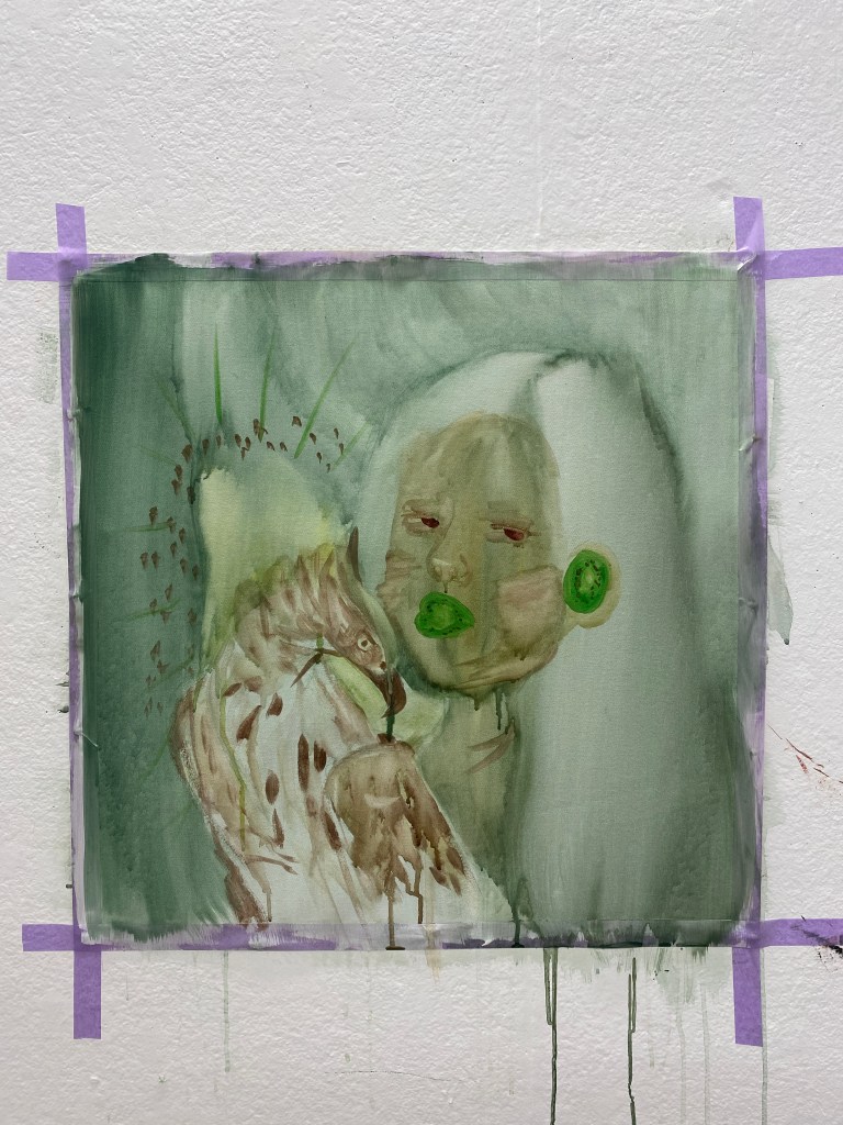 In this work, I was inspired by René Magritte and František Kupka. René Magritte surrealism work of figures with familiar objects in an unexpected representation. František Kupka used nonnatural colours for some figure works. The colour palette I used was like the kiwi fruit. I made it as if I was a kiwi fruit because I’m a Kiwi/New Zealander. I made sliced kiwi fruits as my mouth and ear. This symbolises me only speaking and hearing one language. Yet I have the Philippine’s hawk-eagle facing towards me. I’m leaning toward the Phillipine hawk-eagle. This portrays me trying to get to know my culture more.