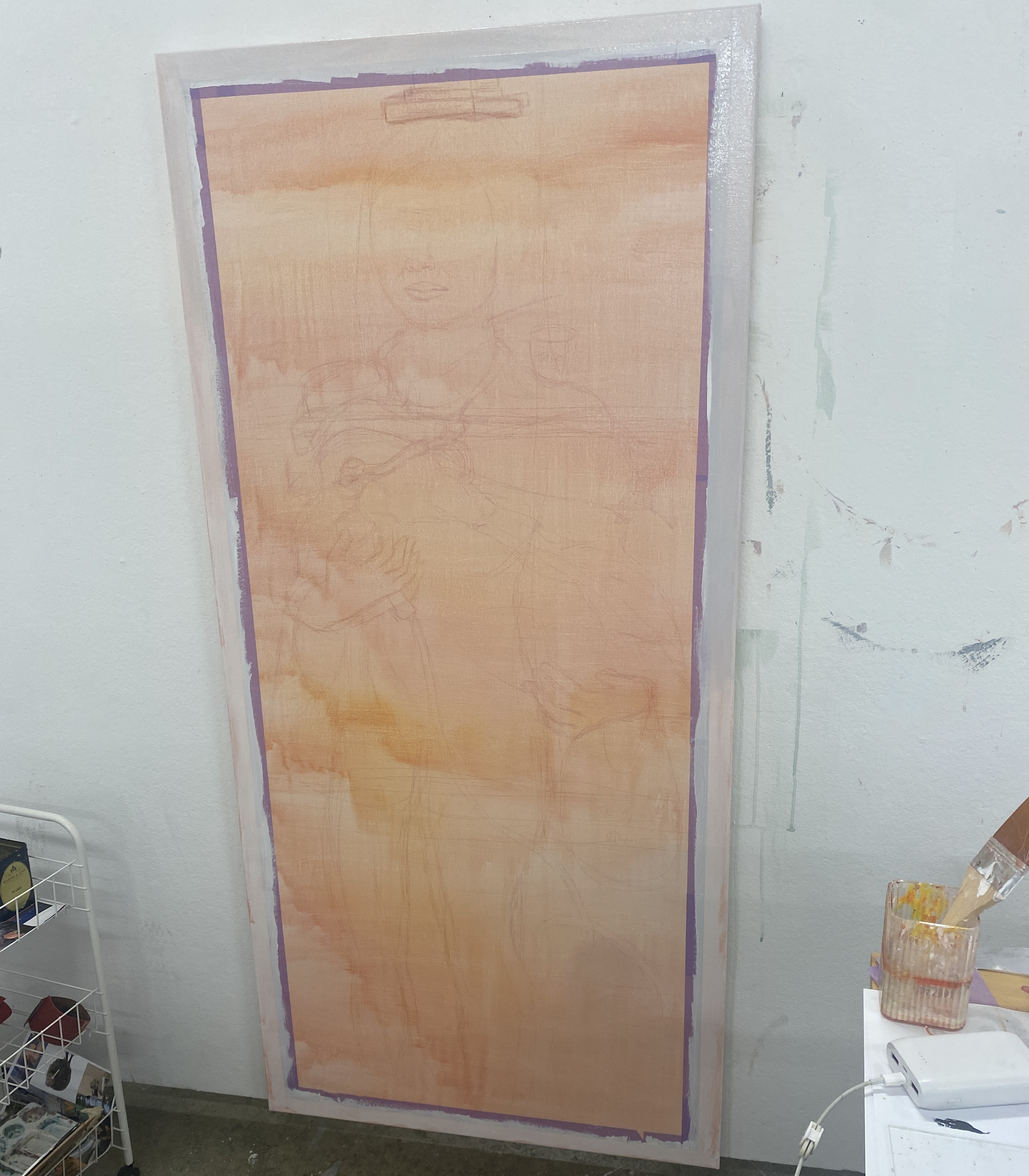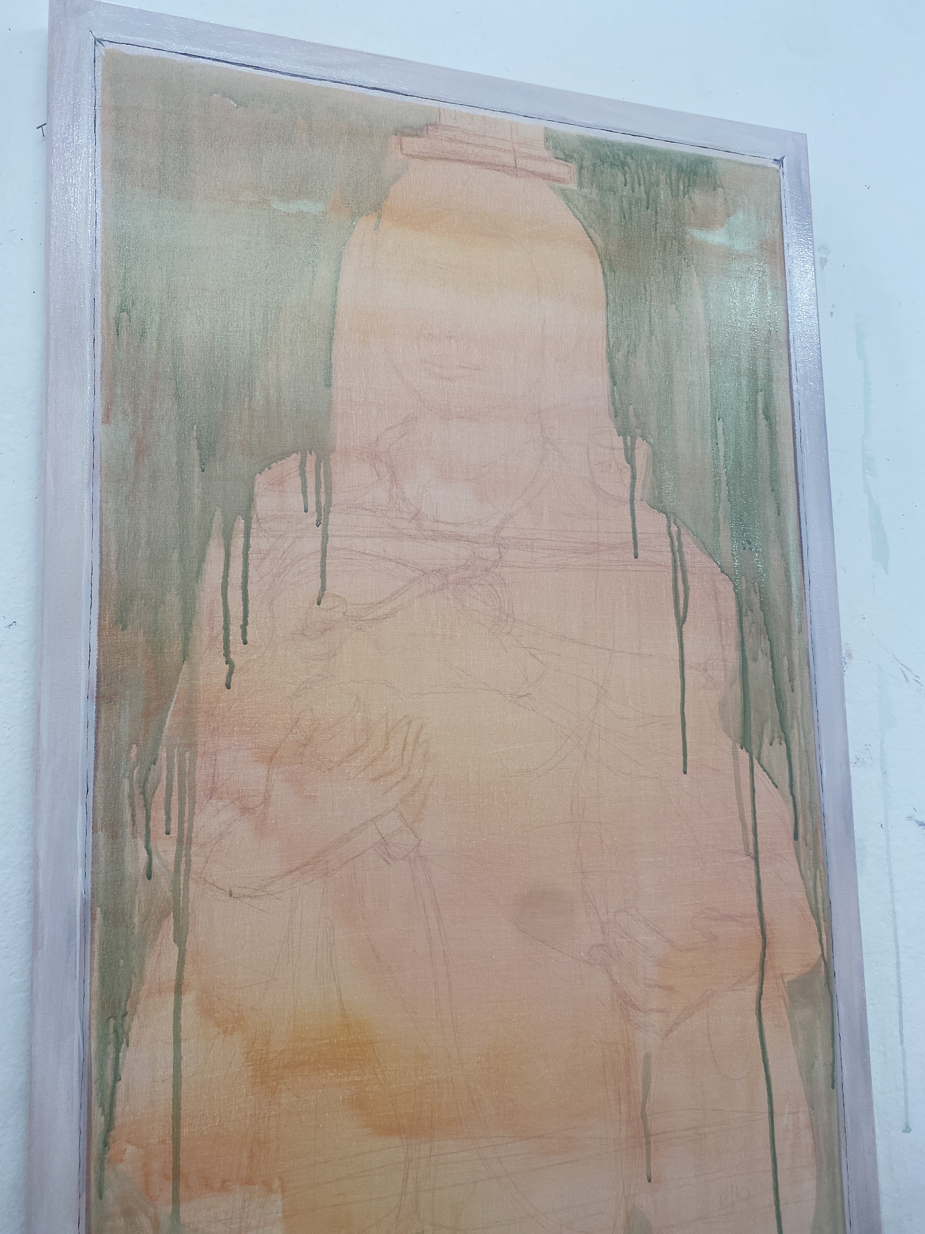 I made this canvas (120cm x 75cm). I wanted it to be like a mirror. I gesso the canvas 4-6 times. I tone the canvas with orange/yellow warm tone acrylics. Sketching myself with coloured pencil over the paint. I think painted my mirror frame from my bedroom (which is a white plain frame).