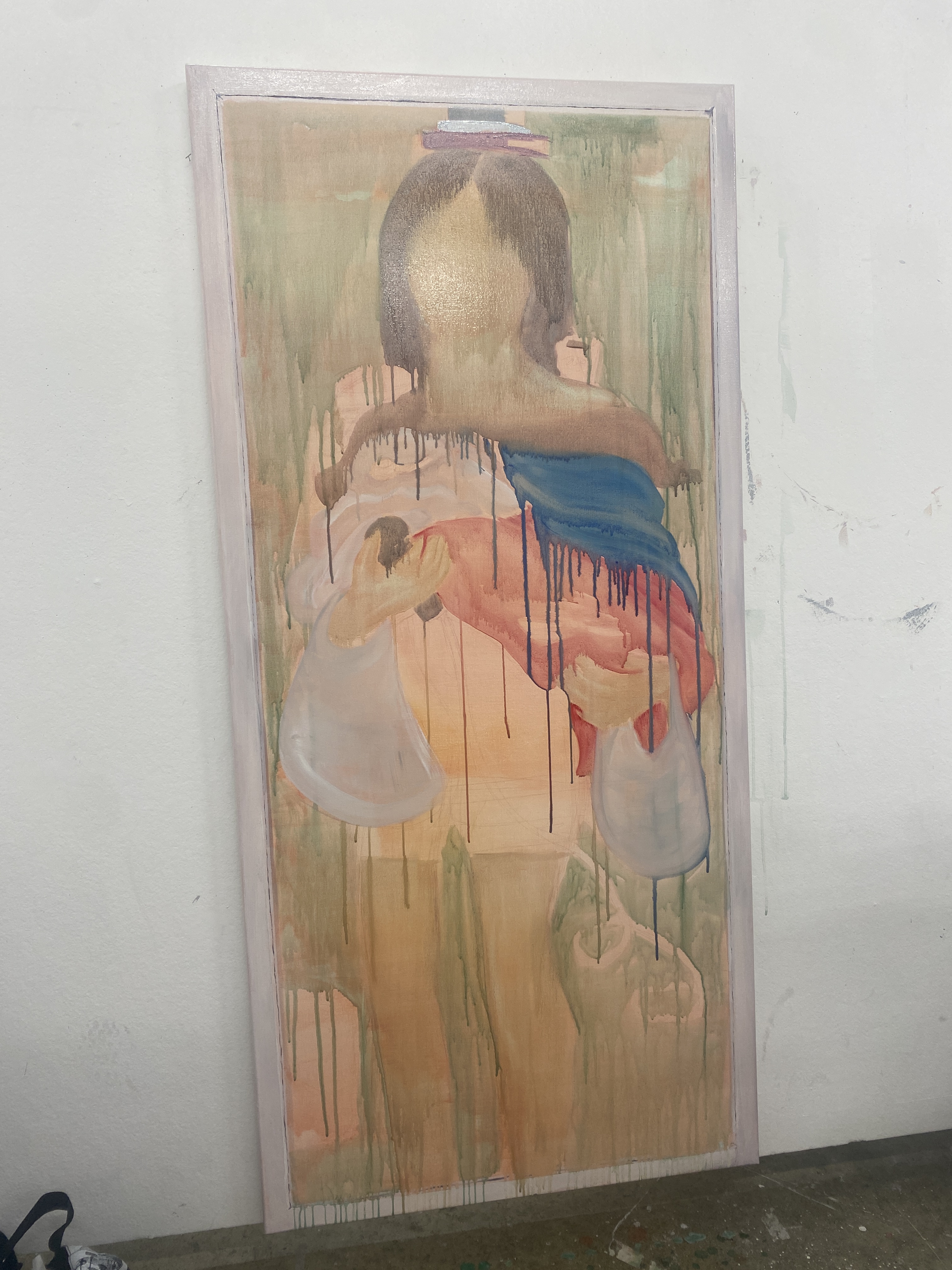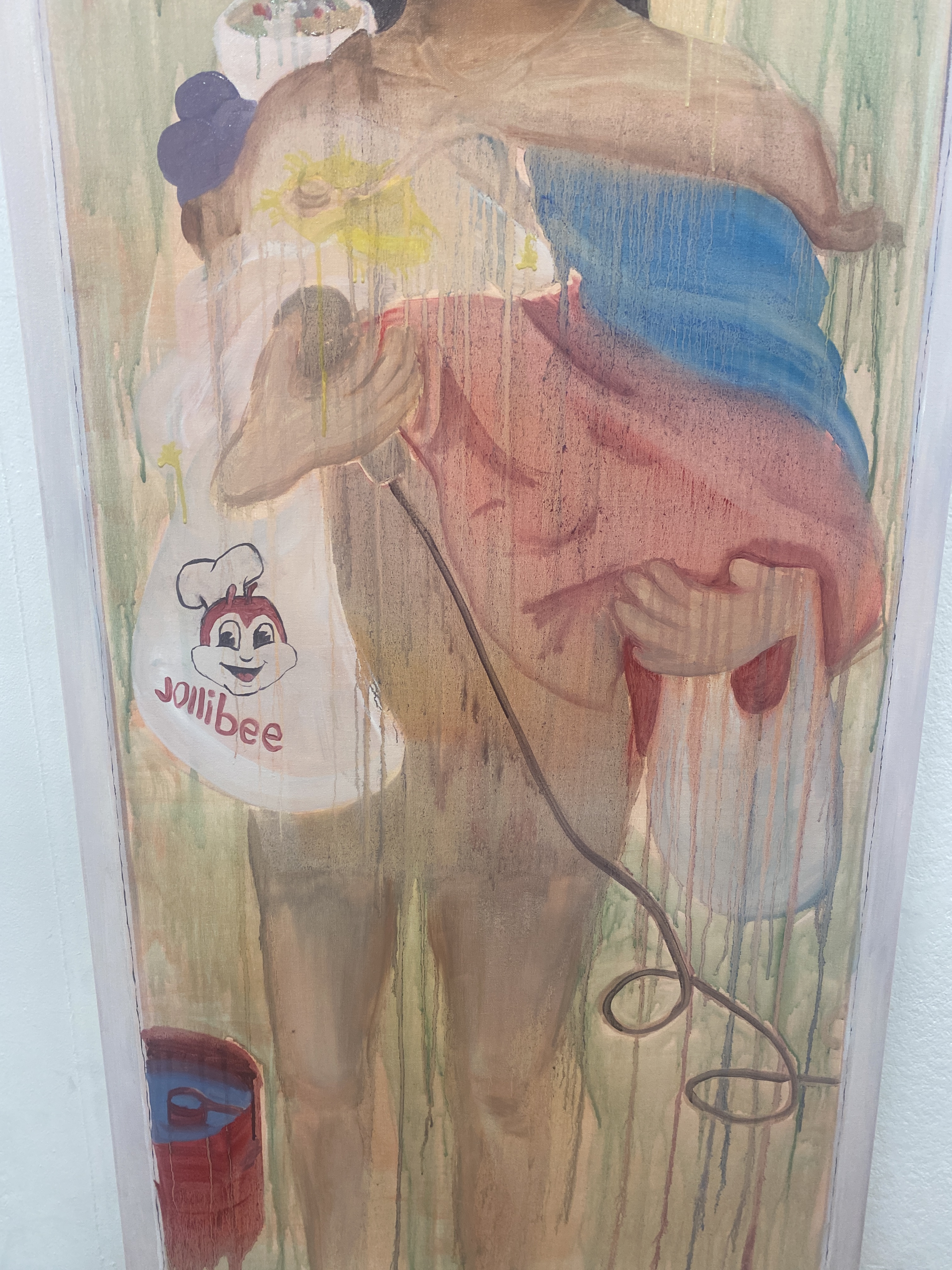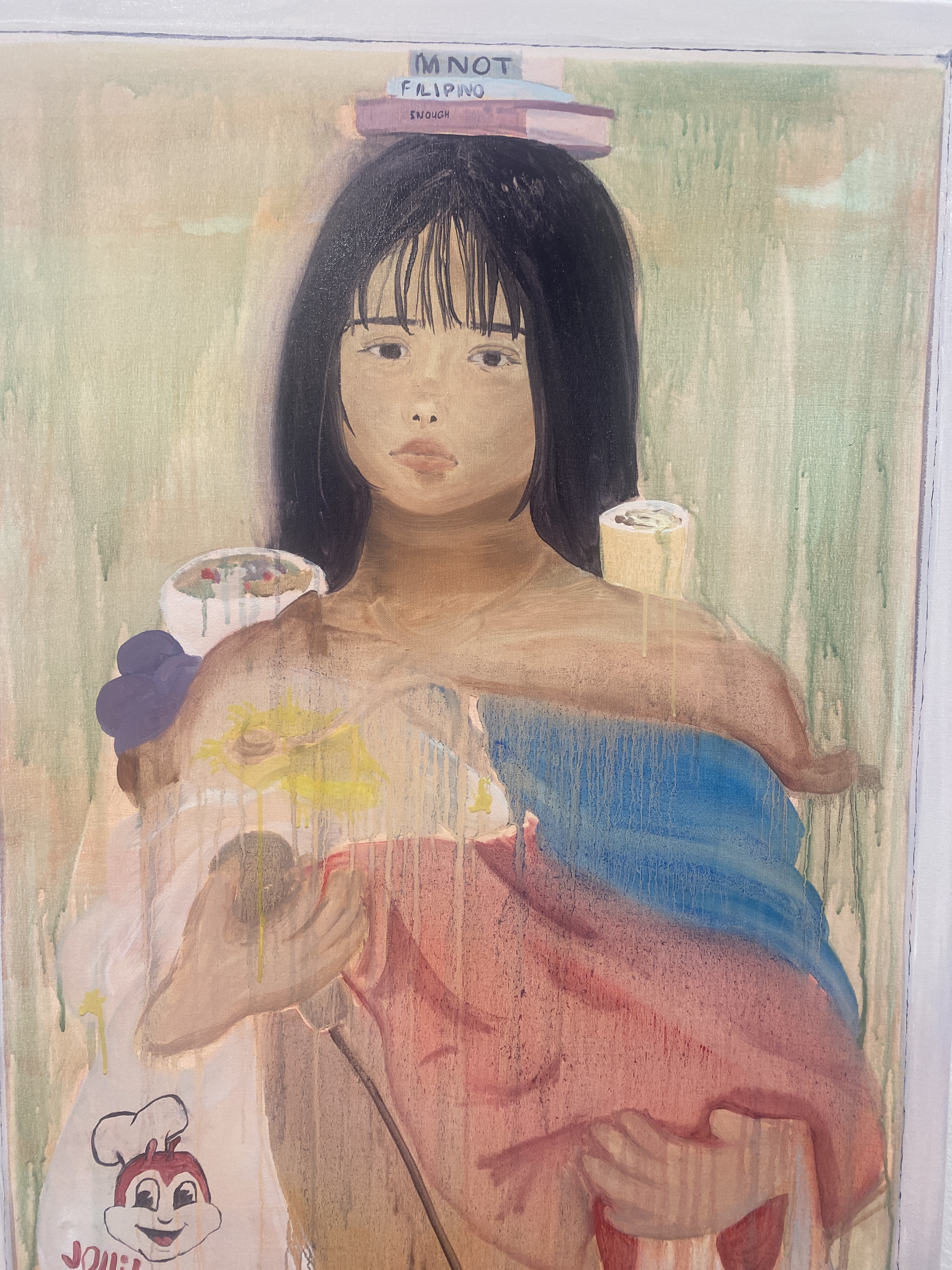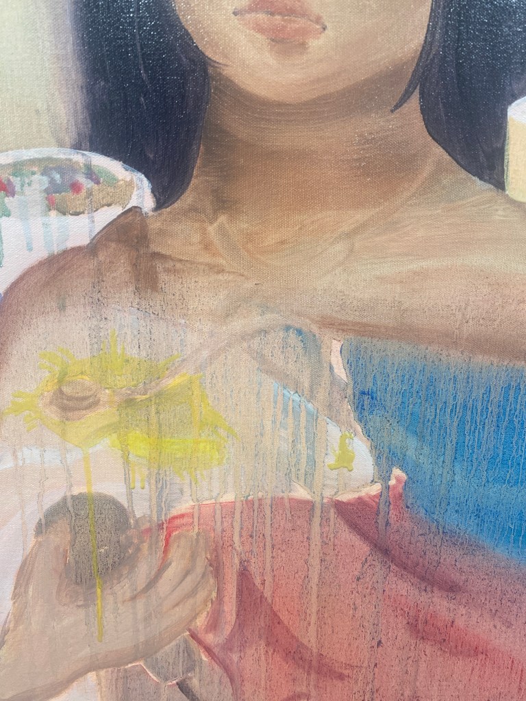 I first thought the drips were too much. However, my first intentions of these items were memories and I thought it envisions the idea of faintness of these memories. There are hidden memories in this painting that I may only can recall in my head. For example, the invisible stethoscope I’m wearing on my neck. It’s a stereotype but most Filipinas become nurses. Most of my Filipino best friends from high school went straight to University to study to become nurses. I was thinking about it, even though it was not my passion. So I took a gap year and thought about it. Another hidden memory was the covered in drips plastic bag with faint sticks coming out from the top right of the bag. It’s a faint positive memory of my uncle (who has now passed) holding the plastic bag with my sisters and I’s favourite filipino street food called “Bananaque”. He’d surprise us mostly everyday in our visit at his place catching up with our cousin.