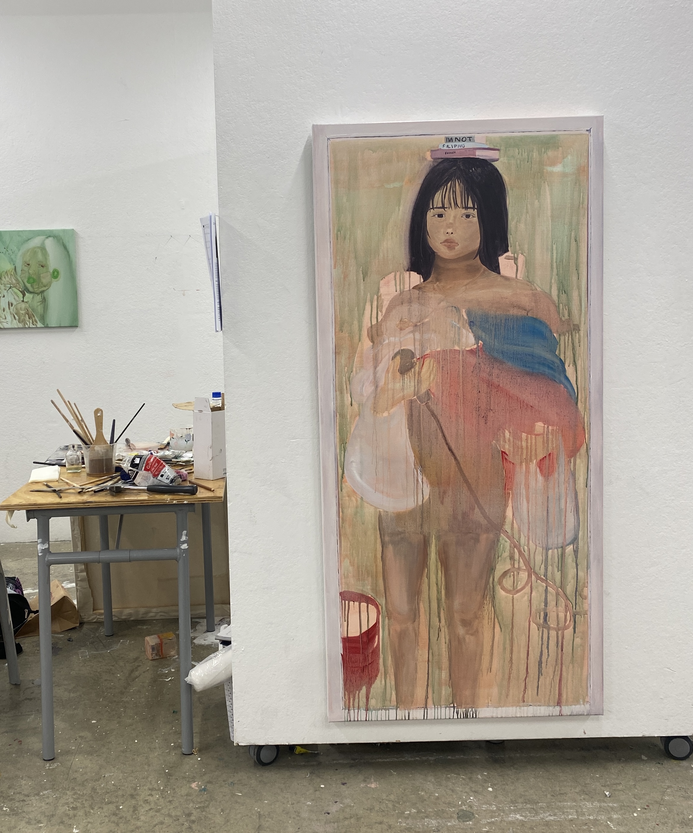 This painting is titled “You’re not Filipino enough”. The painting process was difficult to paint as it took a lot of courage to reflect back on memories looking at myself in the mirror. I used oil paints, W medium, and water.