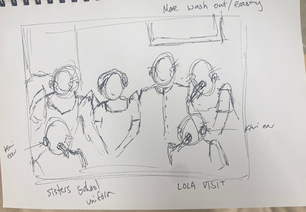 A faint memory using photo references of my family photo with Lola(Grandma) in the Philippines in 2012. This photo was taken at the same place seen in my painting “Revisiting Lola’s House”, but on different couch. Using the motif of Kiwi fruit of ears and mouth. My sisters and I wearing our New Zealand school uniforms. While my parents and Lola wearing Kultura cultural Filipino clothing.
