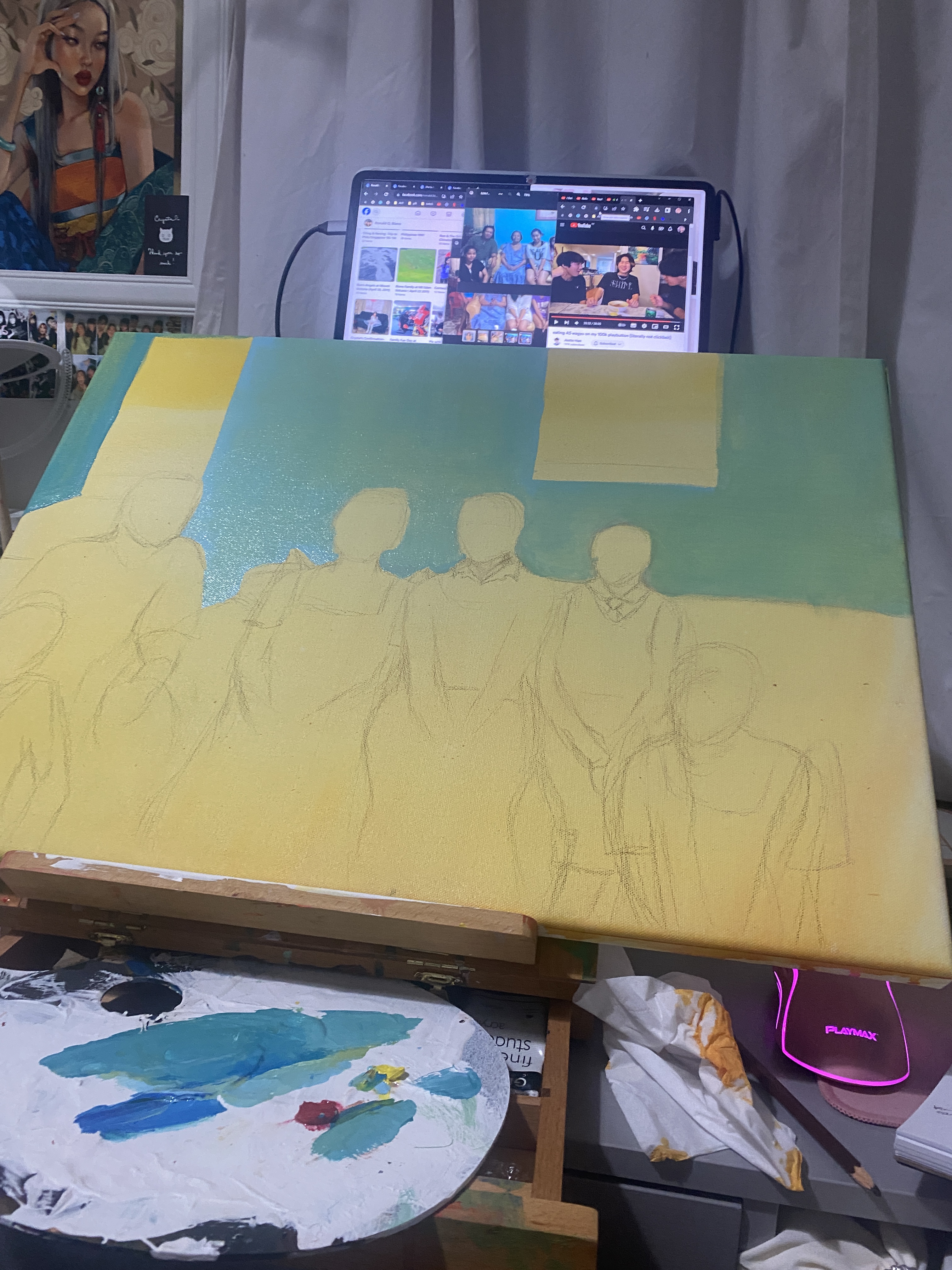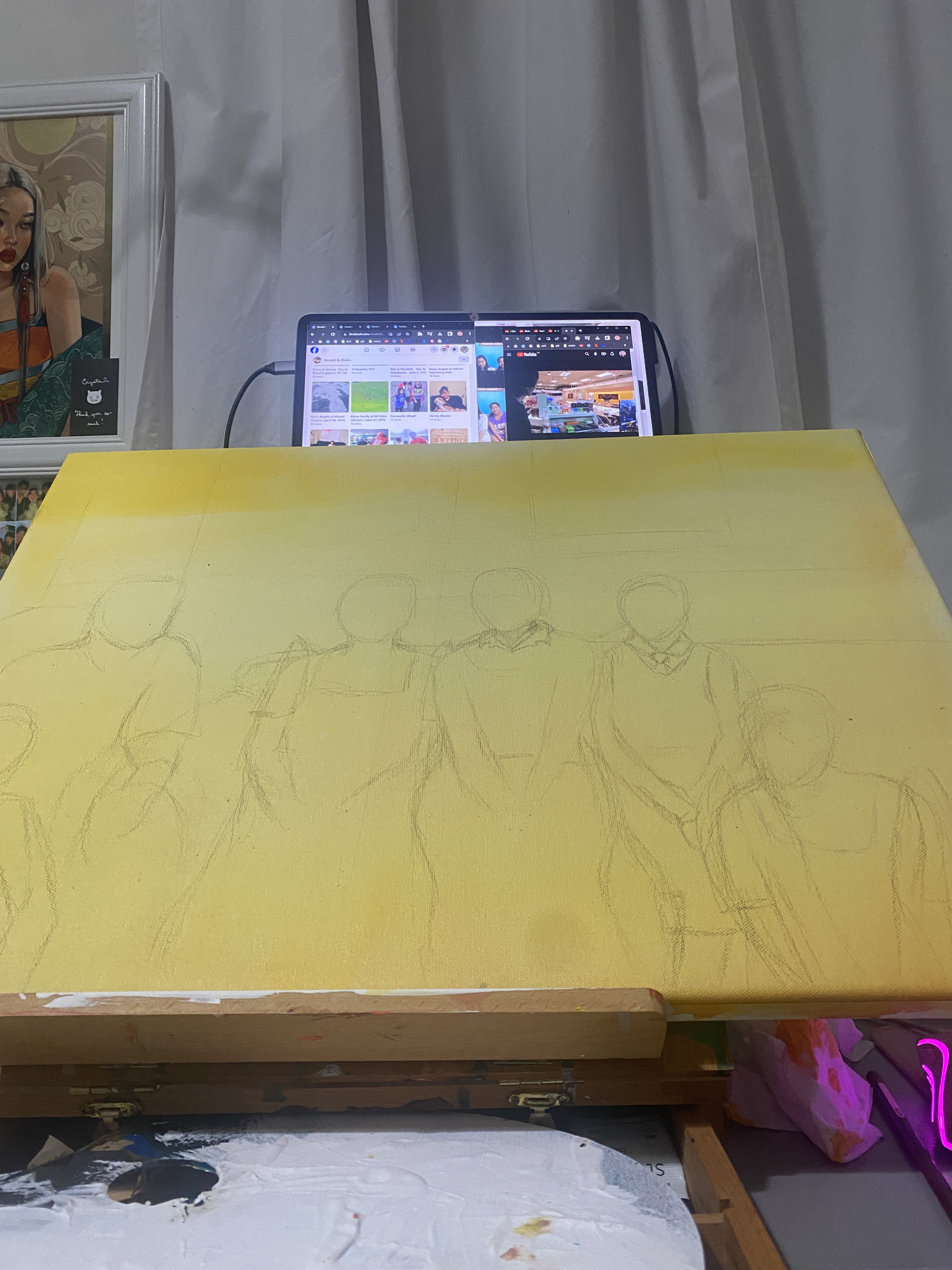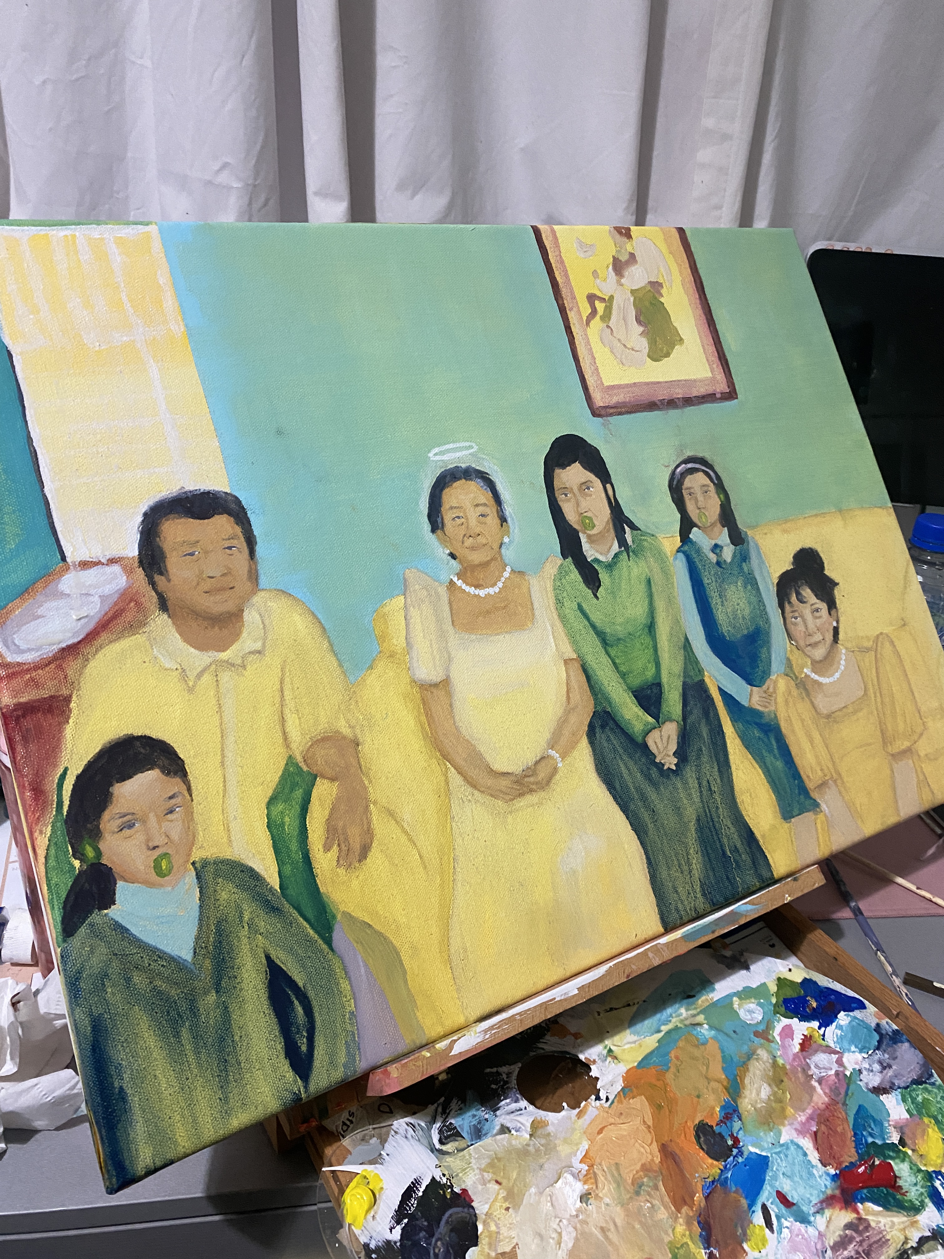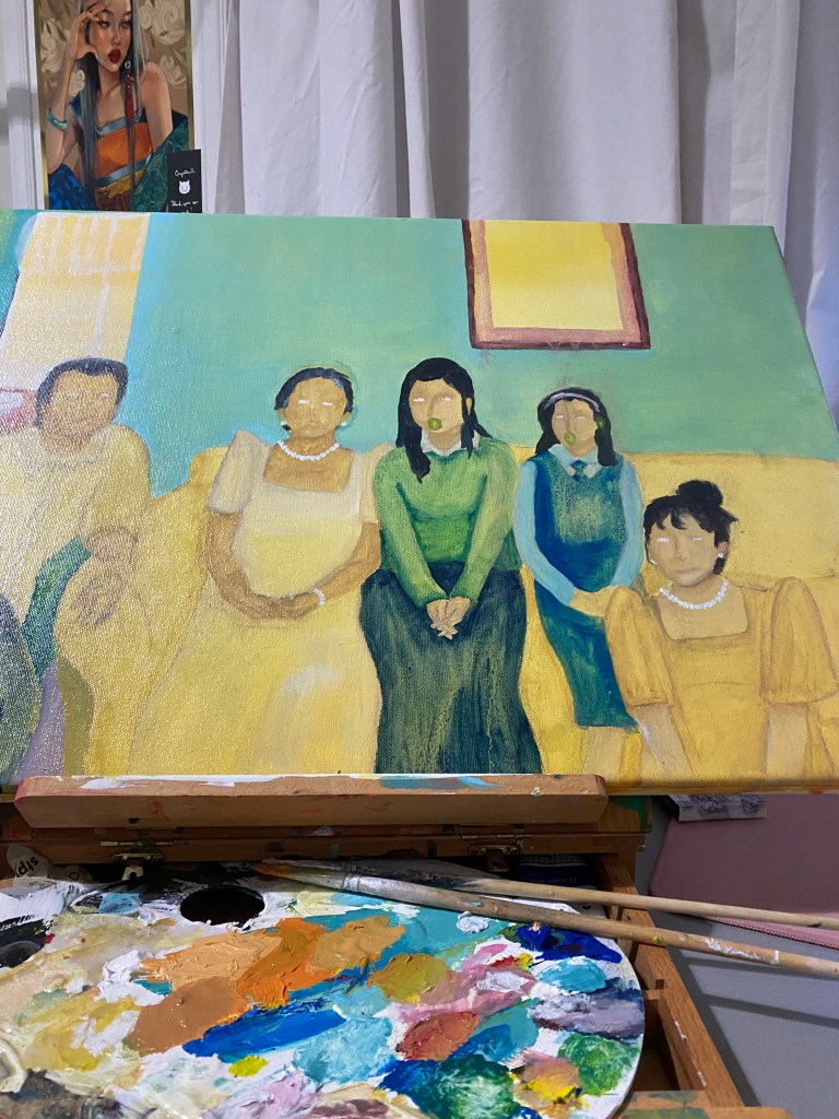 I decided to do a wash/tone of yellow orange acrylic to give a more warm and happy feeling. Same walls and picture frame from the reference photo. I painted like watercolour using oil paints with the background and figures clothing. However, everyone’s faces are painted more with realistic and some with abstract motifs. The kiwi fruit as a repetition of my sisters and I can only hear and/or speak Kiwi english.