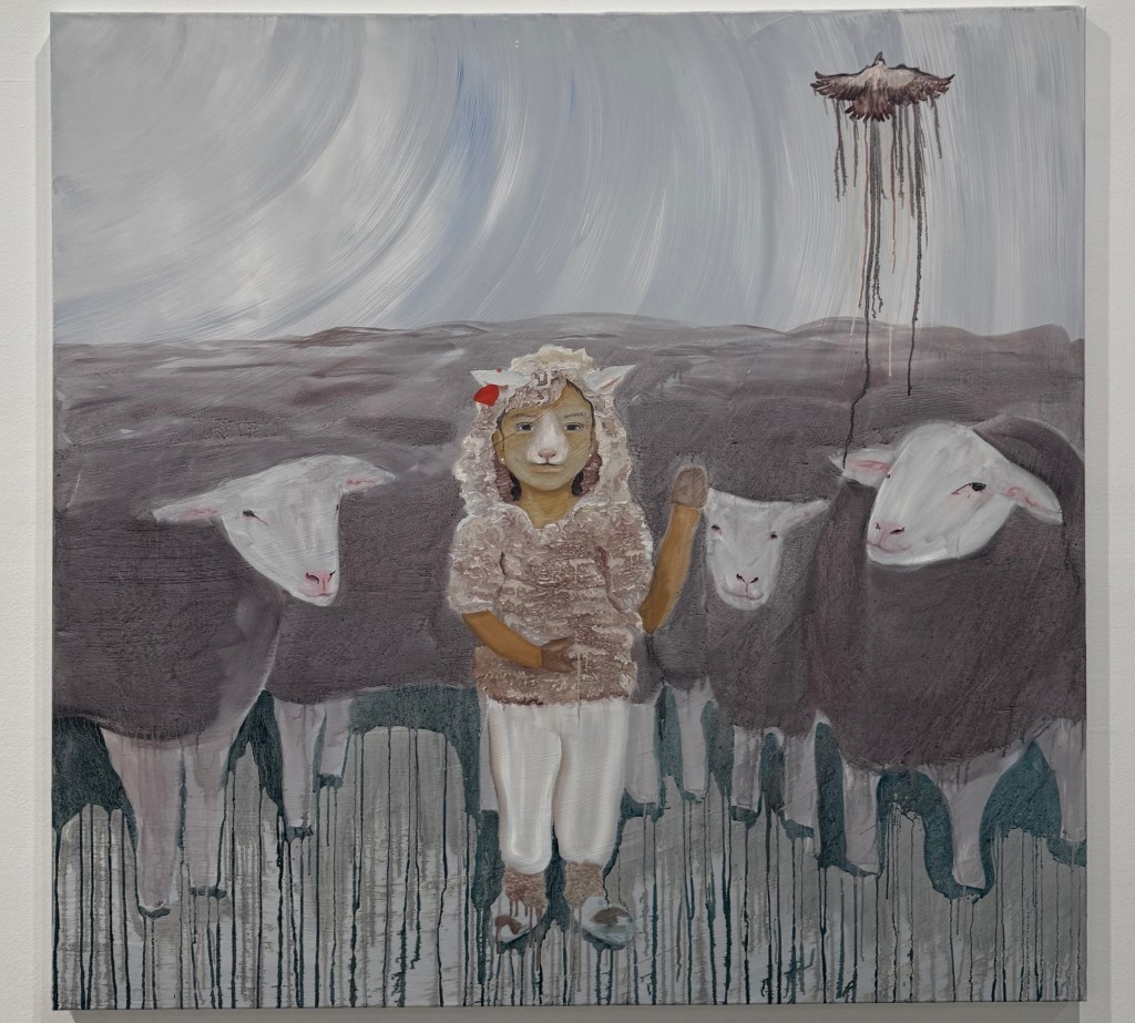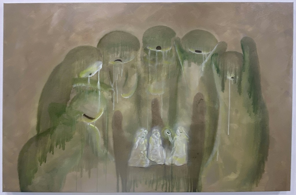 My artistic process involves looking through childhood photo books, drawing from memory, and creating imaginary narratives. Each of these artworks has been personally stretched by me, adding a tangible connection to my practice. Utilizing oil paints blended with medium W, I mimic the delicate qualities of watercolour, employing a drip effect to reflect the fluidity and impermanence of memory and identity.