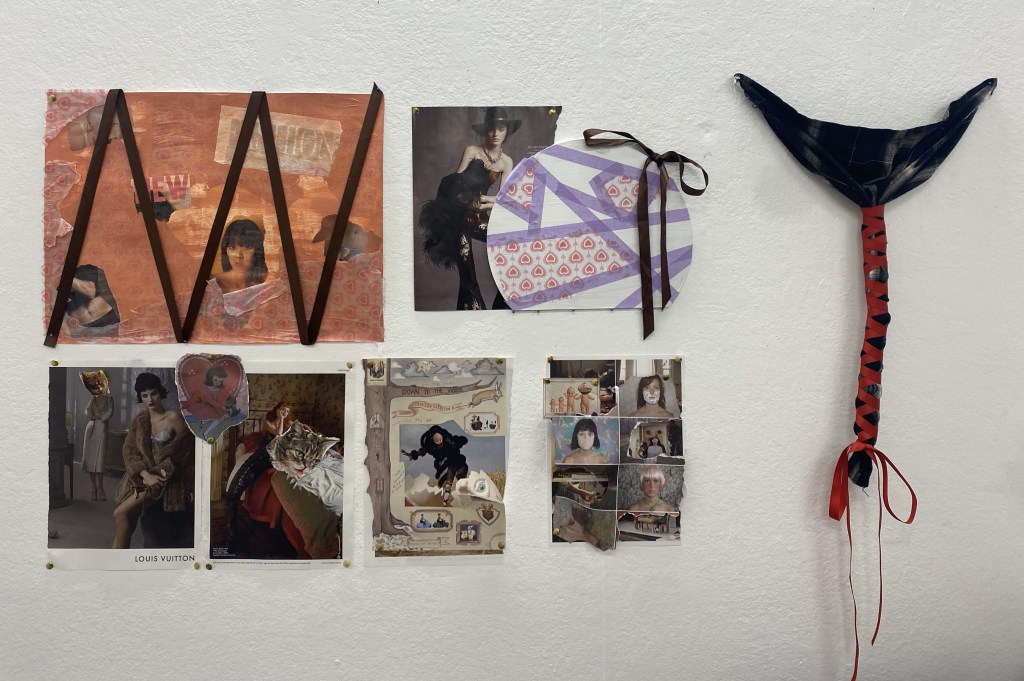 Today, we put together our materials. I brought fashion magazines and ribbons. I tried my best to think what I like and the colour palette. I also played with the colours for this display. Something that stands out is the cat. It’s kind of out of place but it still connects with these images.