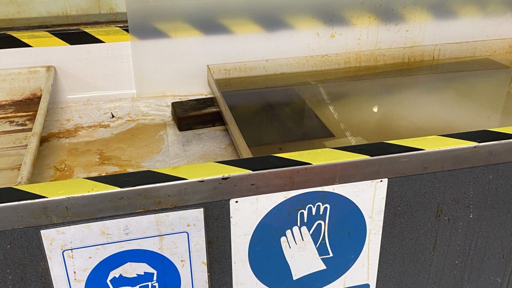 Once this machine process is finished, we place it in the water for 10 minutes. Using a sponge we gently rub the blue side of the metal sheet.