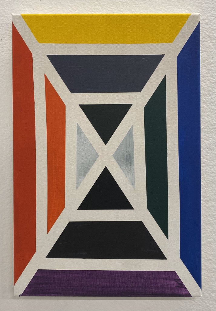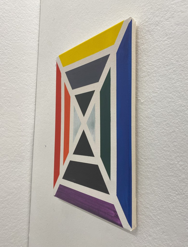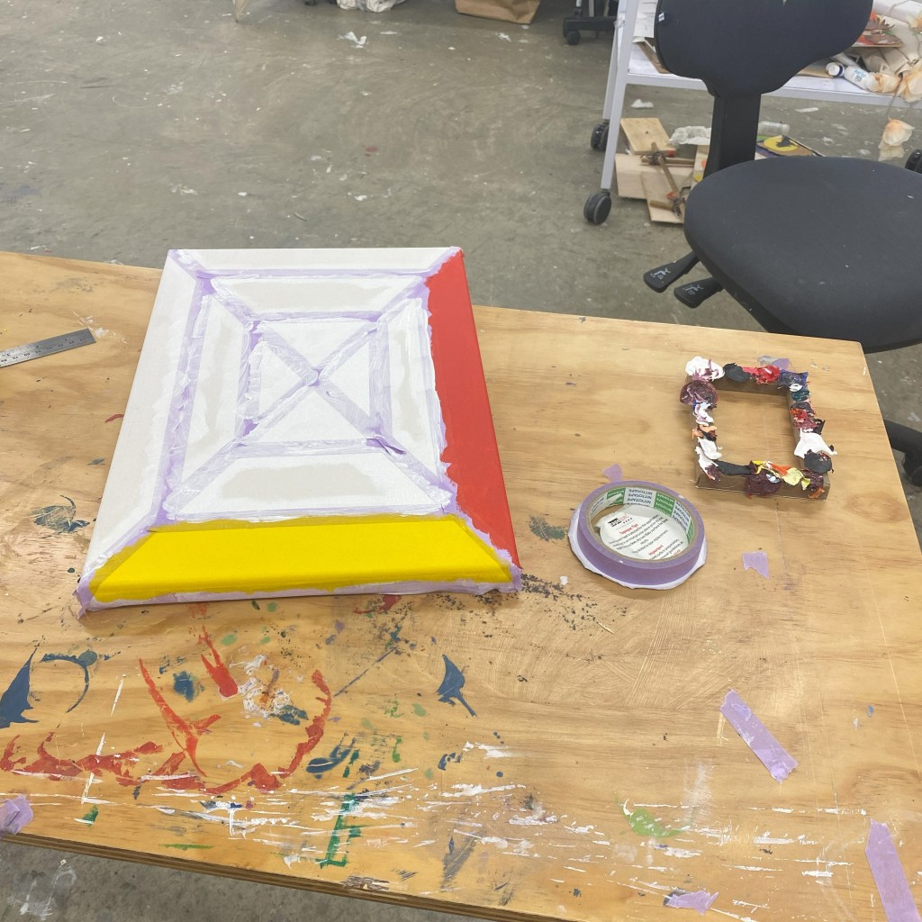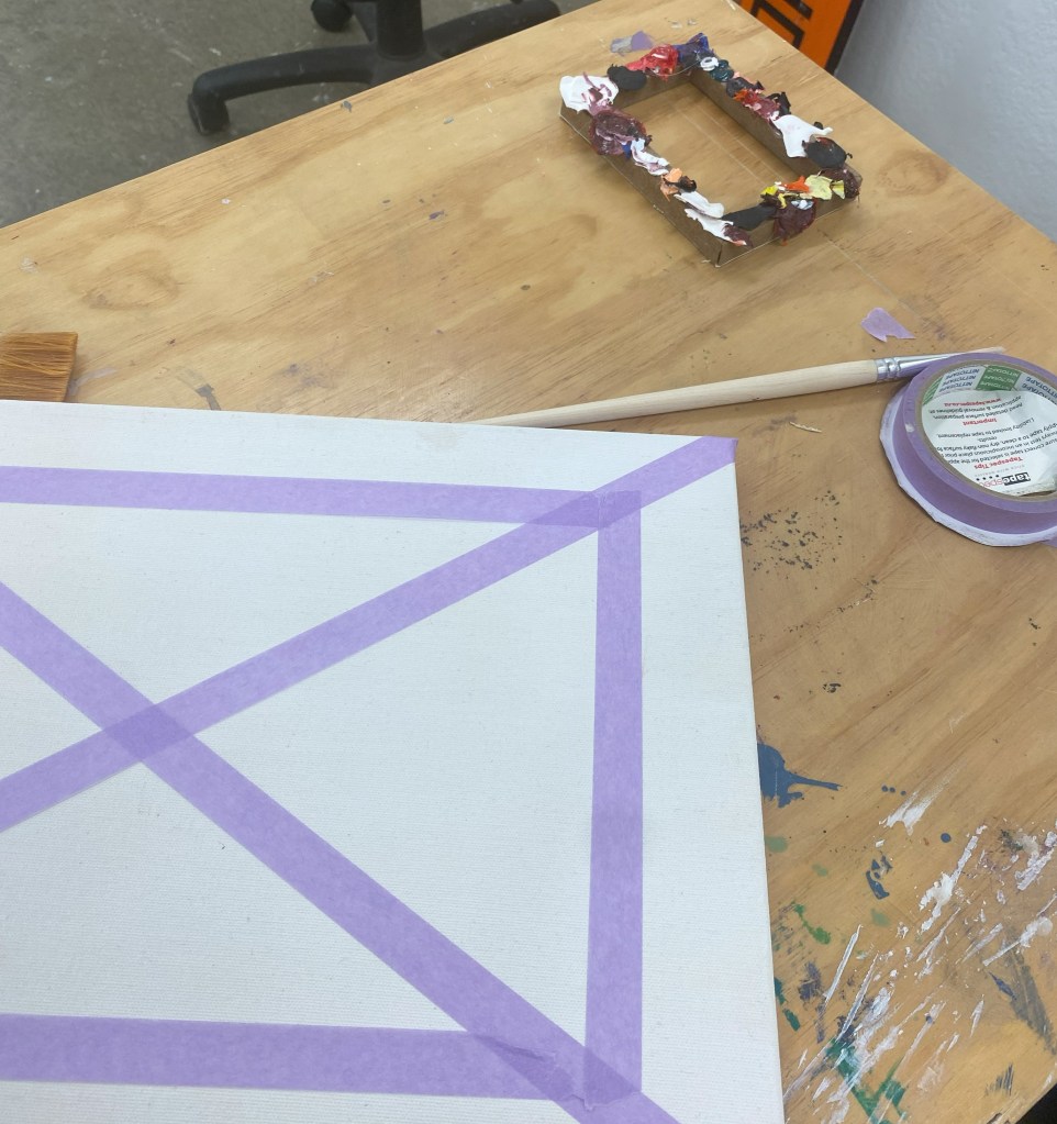 I was gifted a classmates artwork, talked about the work and responded to it by creating an artwork. Once I finished making my canvas, I decided to use some vibrant colours. When I saw her artwork of a frame with dried paint stuck onto it, my first thought was colour theory. I used primary, secondary, and contemporary colours. Having the opposite colours opposite from one another creating a structured relationship between each other. This piece gives a loud sound to the audience. From this activity, I want to experiment more with vibrant colours and framing.